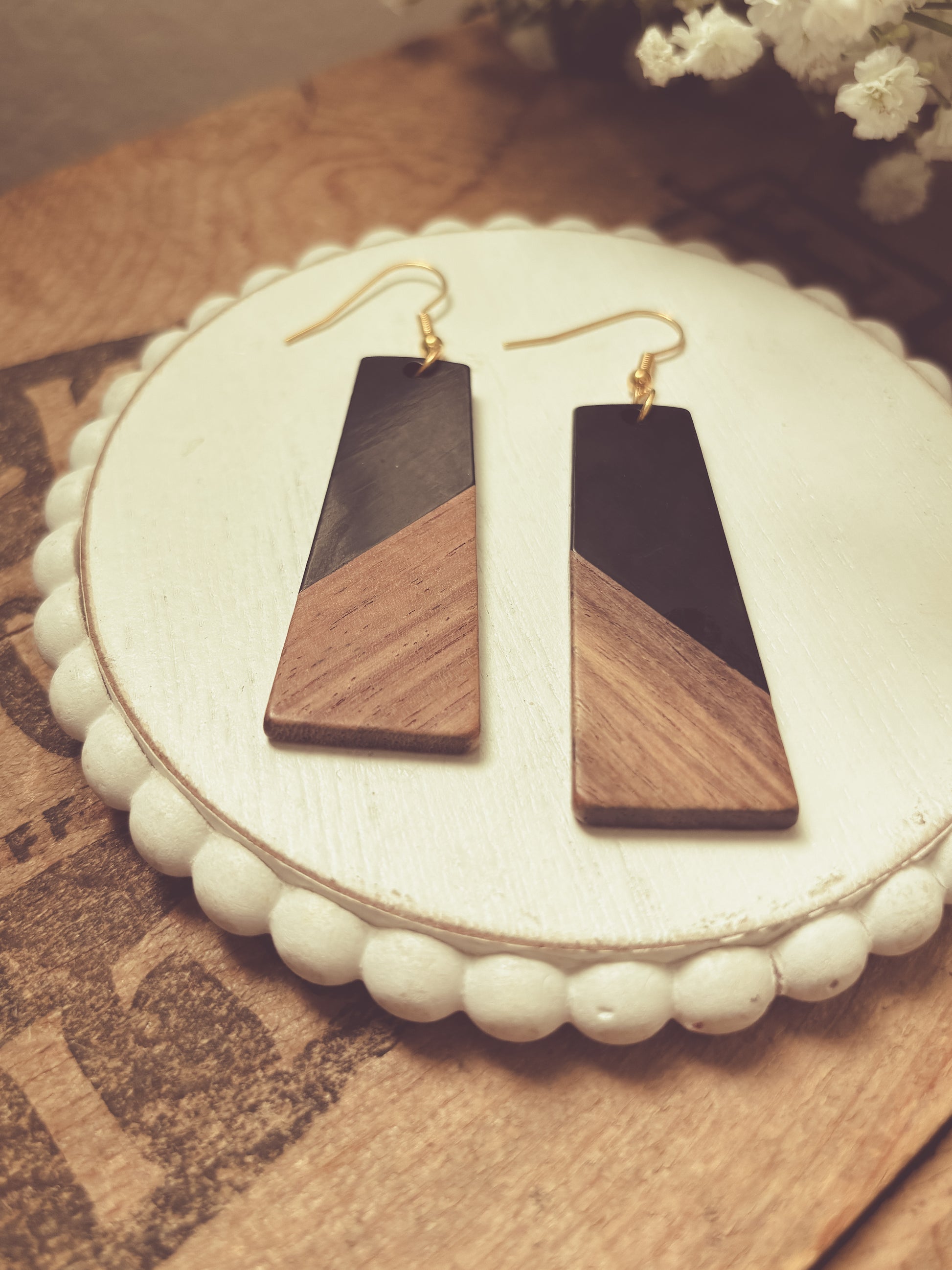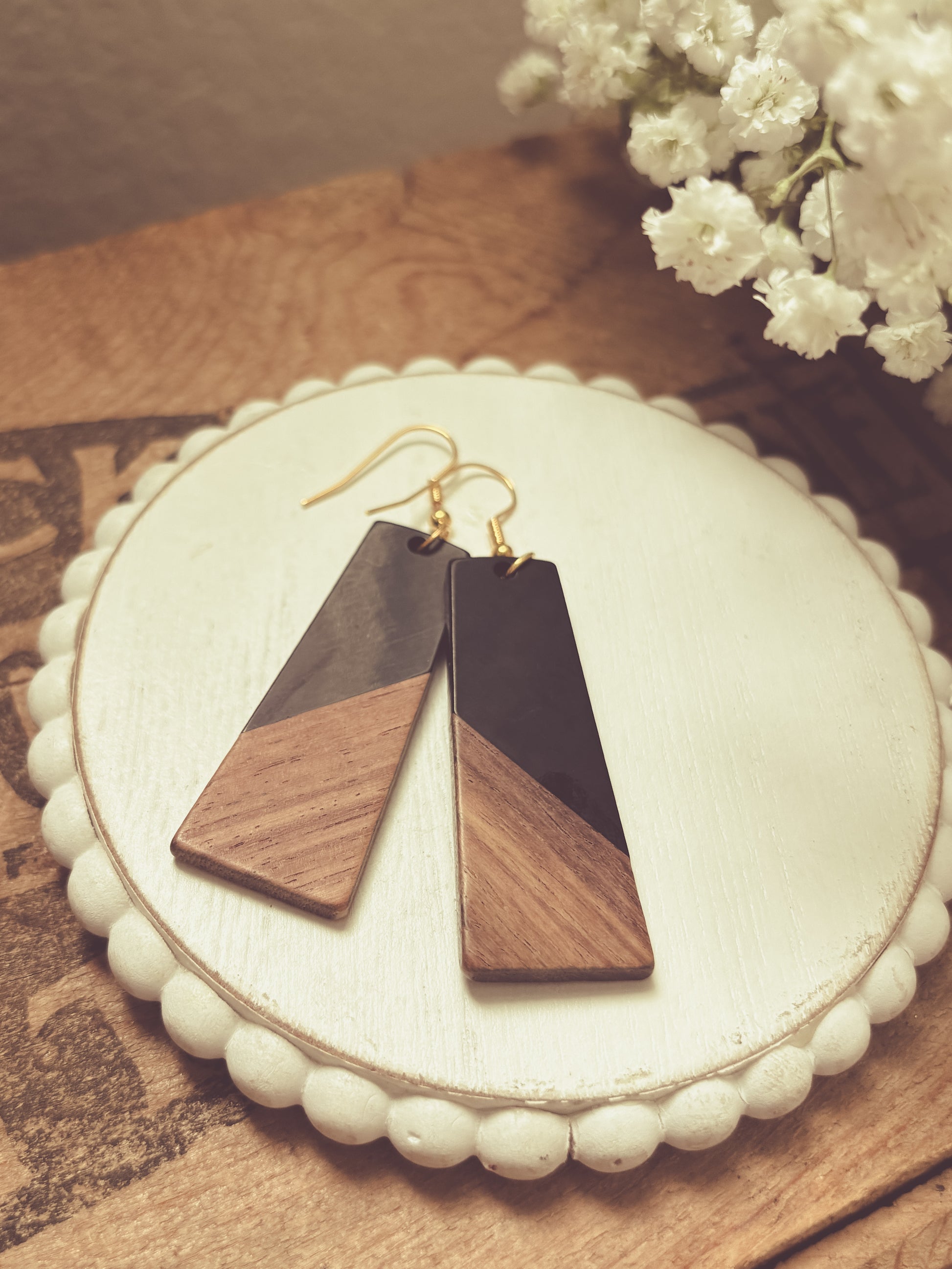 Make a statement with our Beautiful Black Resin and Wood Earrings - the perfect blend of modern and natural. The smooth pink resin beautifully contrasts with the earthy wood accents, creating a unique and eye-catching accessory that will add a touch of elegance to any outfit. 2.3 inches