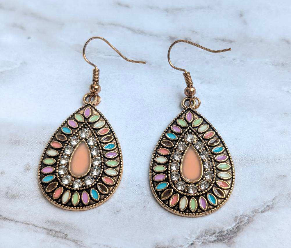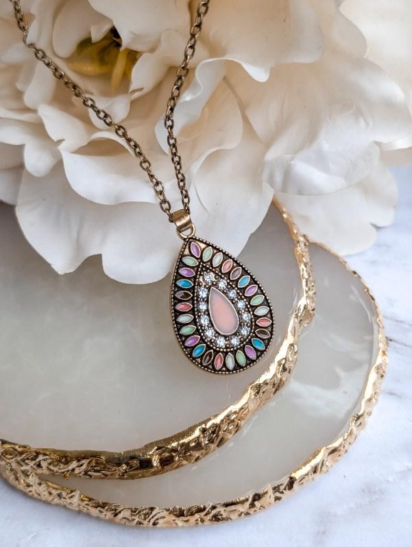 Embrace your inner boho spirit with this Beautiful Boho Pink Crystal Necklace and Earring Set. The unique combination of turquoise and purple creates a stunning statement piece, perfect for any bohemian-inspired outfit or occasion. 19 inch chain