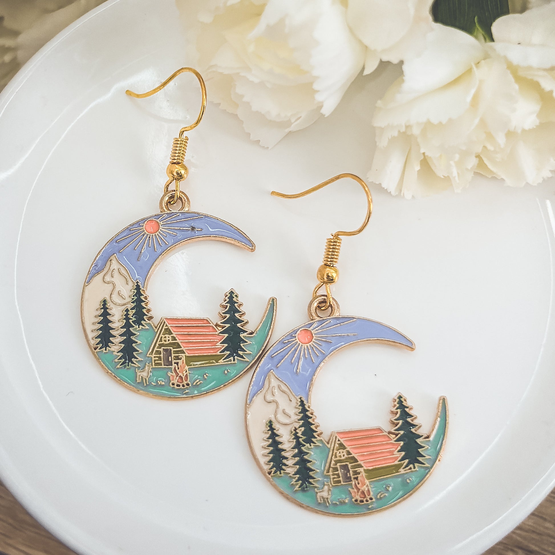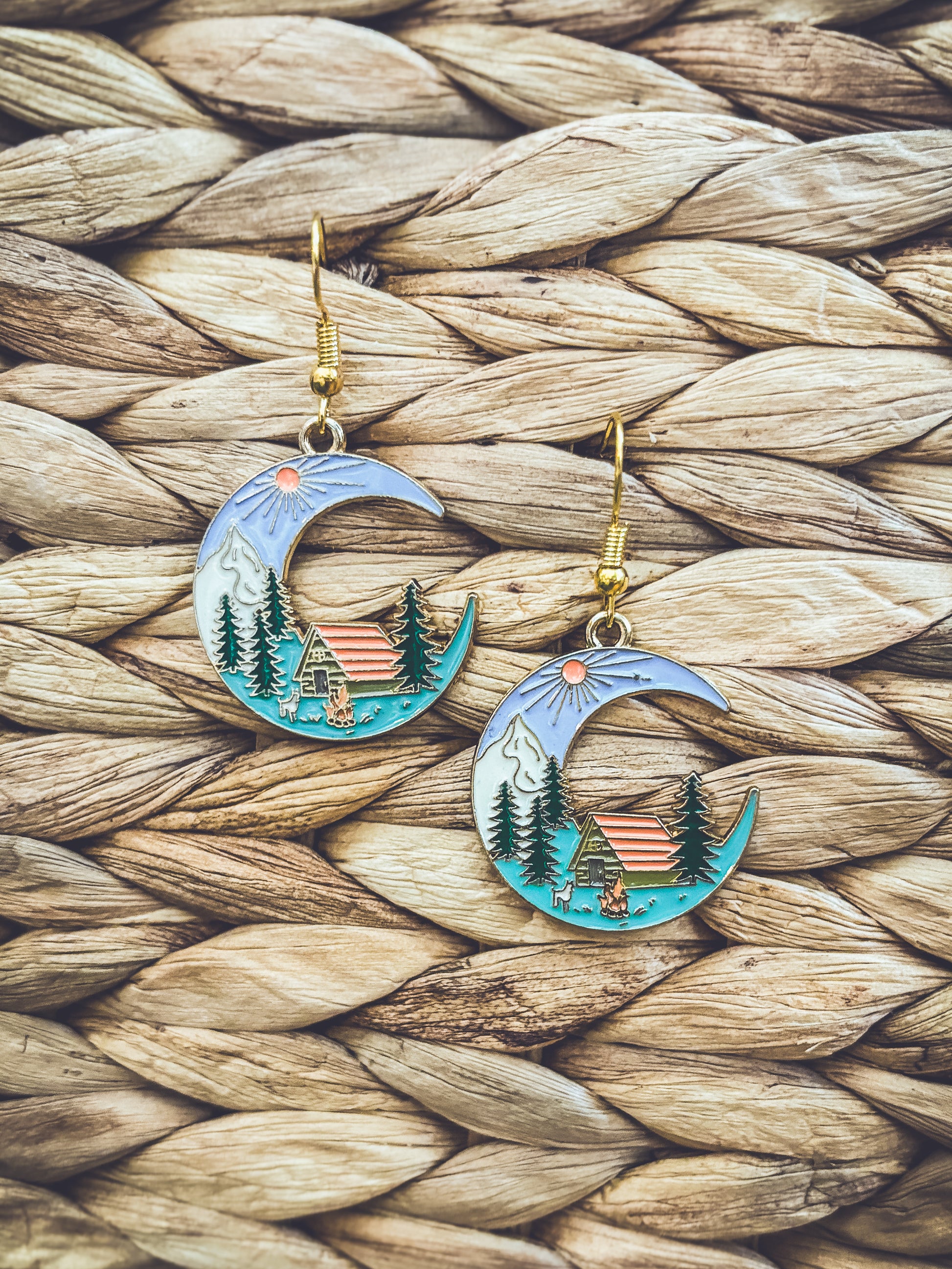 This unique pair of moon cabin earrings is perfect for all your camping and mountain adventures! Quarter sized.
