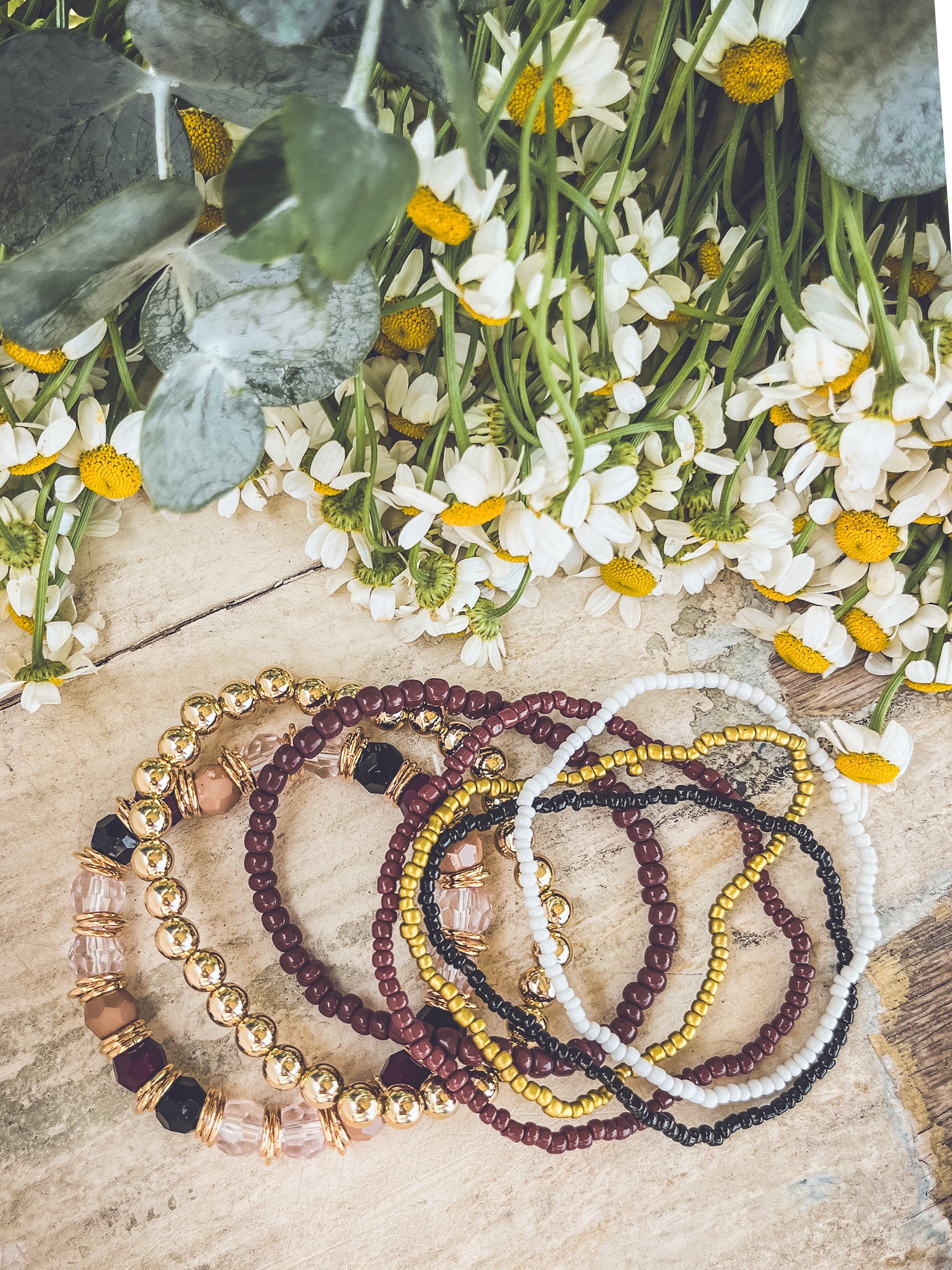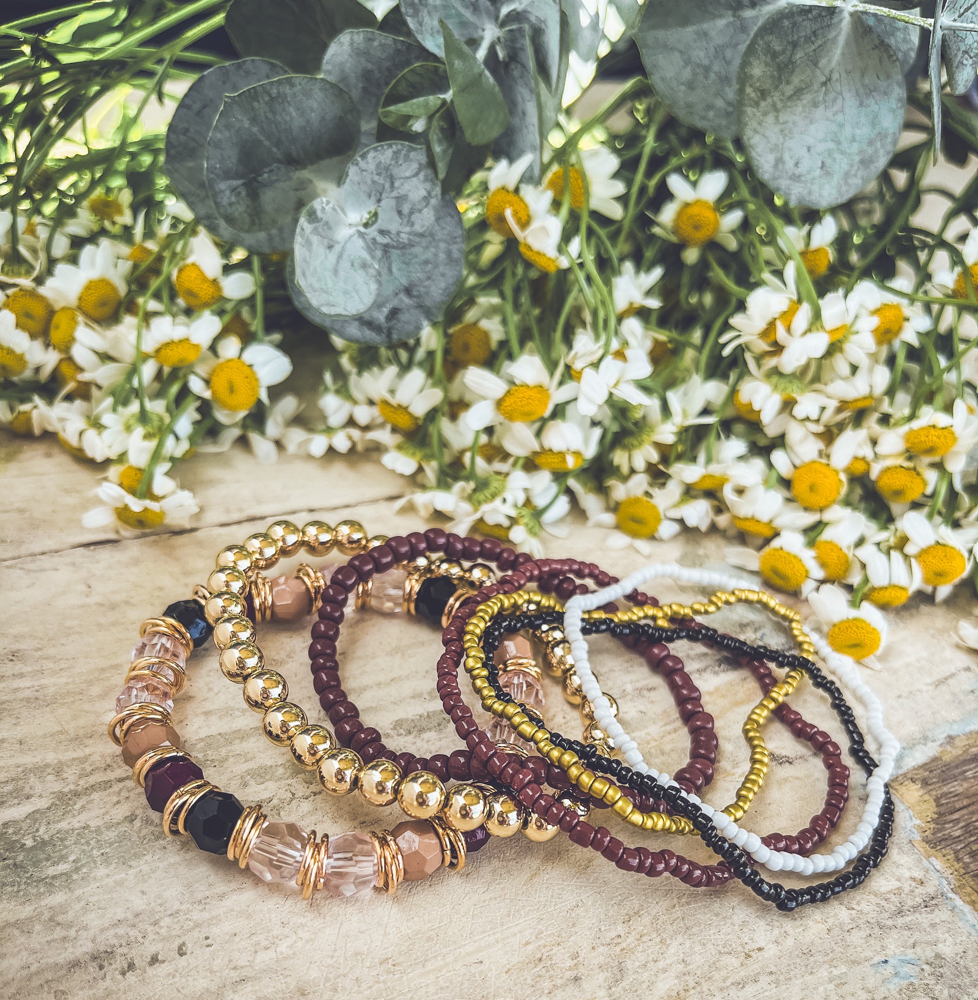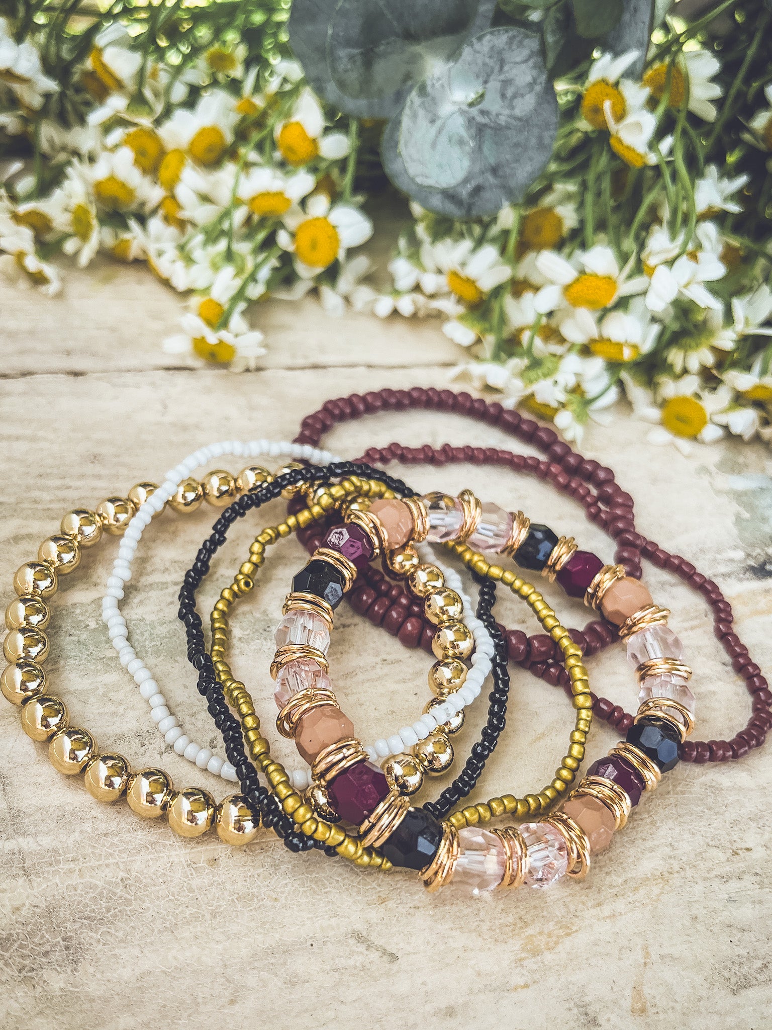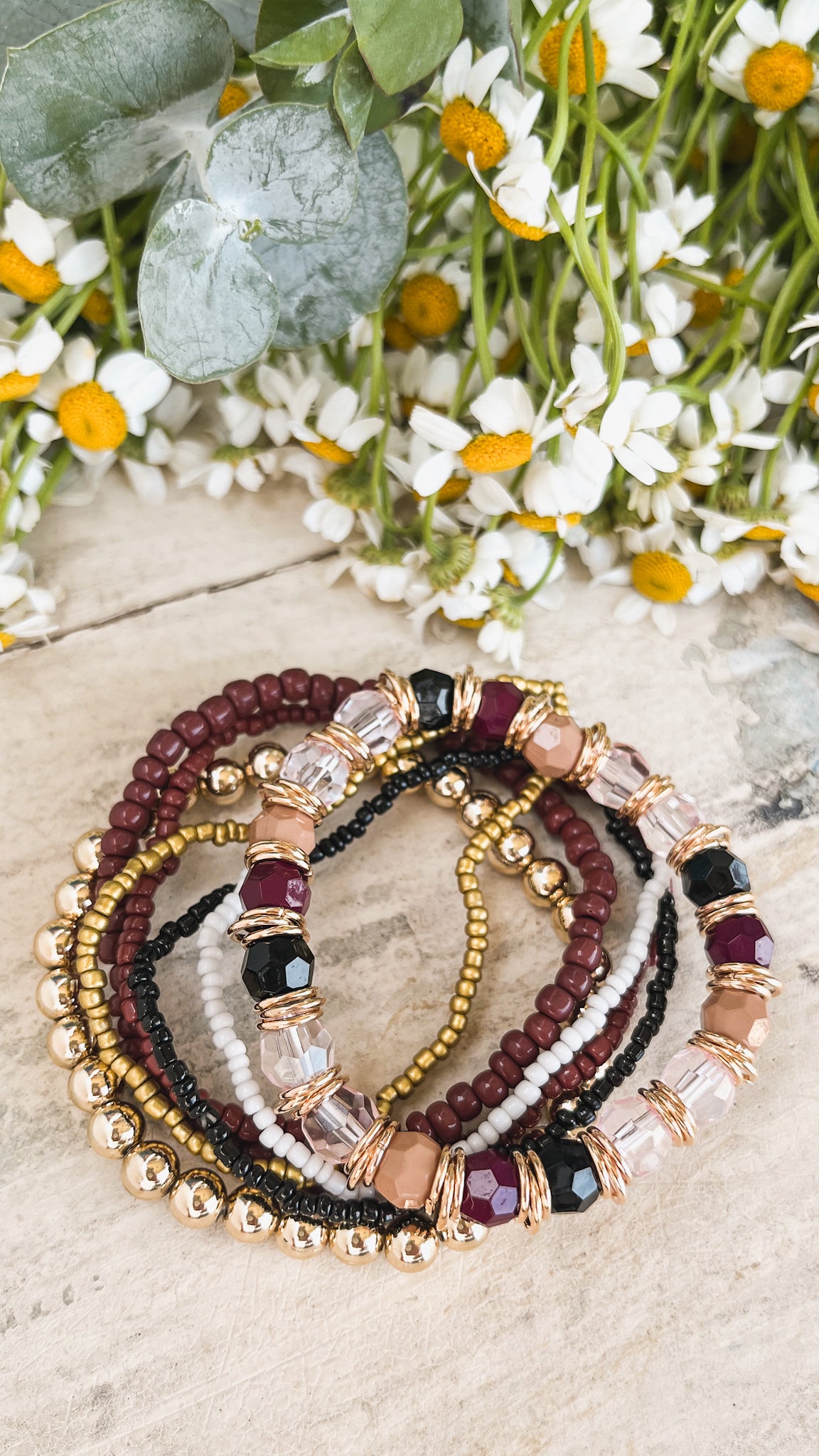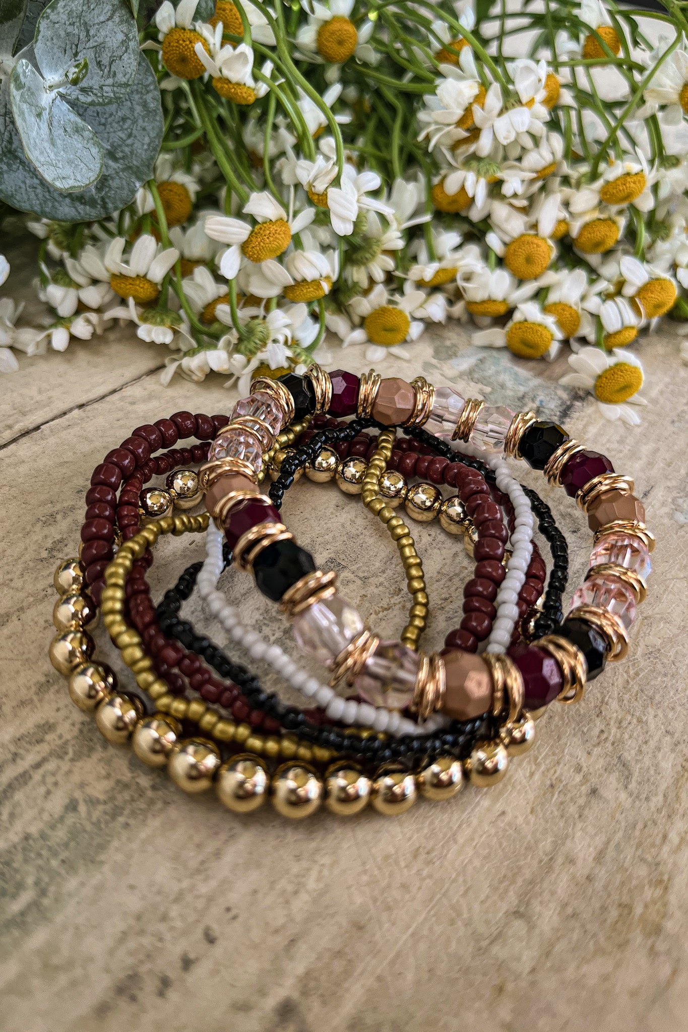 Beautiful Gold and Burgundy Stacking Bracelet Set: Elegant and versatile, this set combines rich burgundy and gold tones. Perfect for layering, adding a touch of sophistication to any outfit.