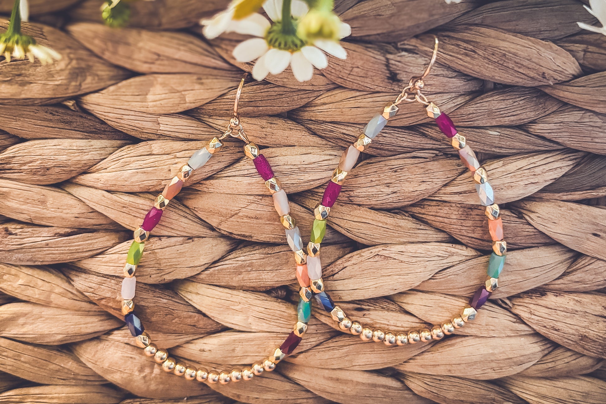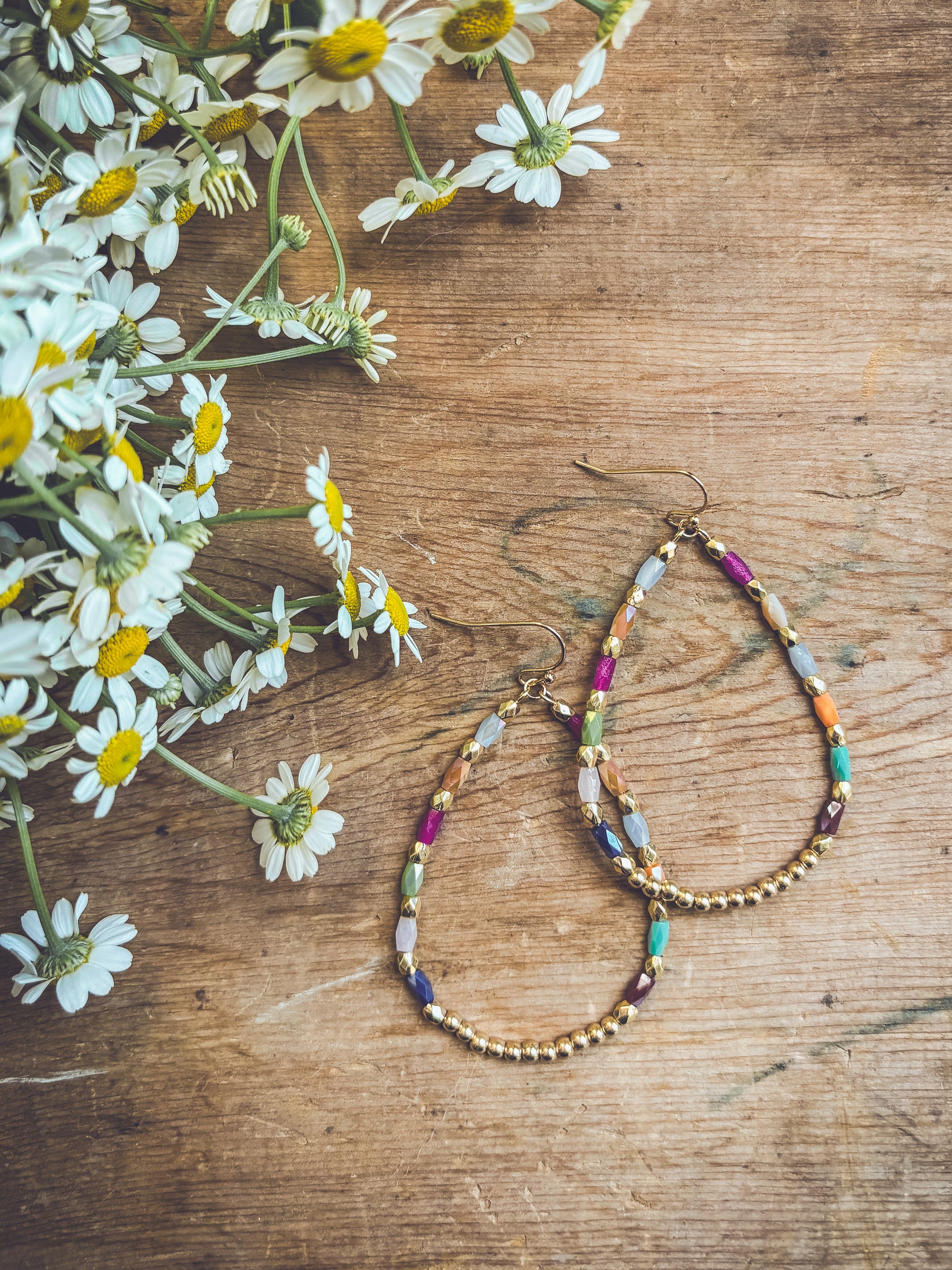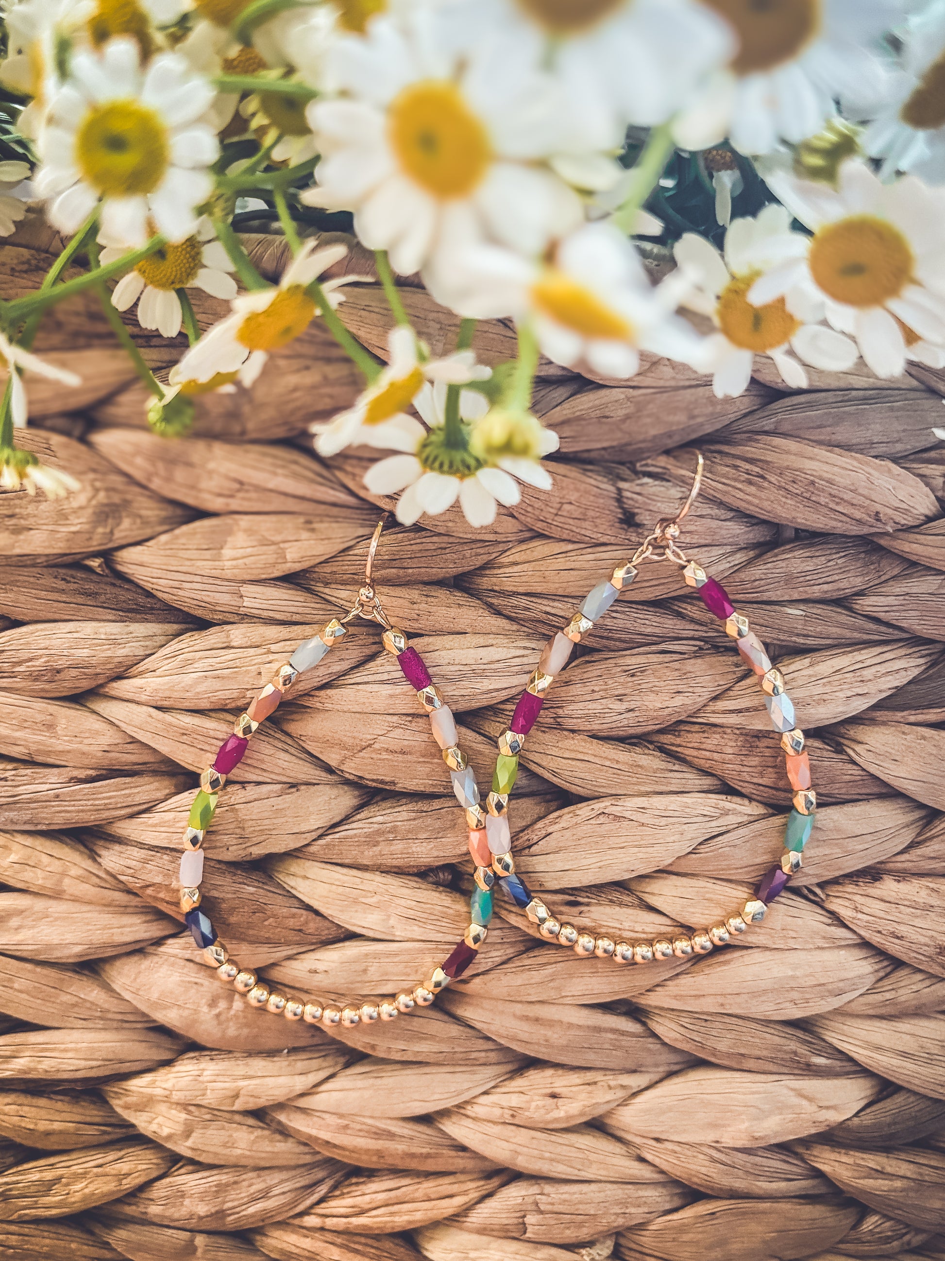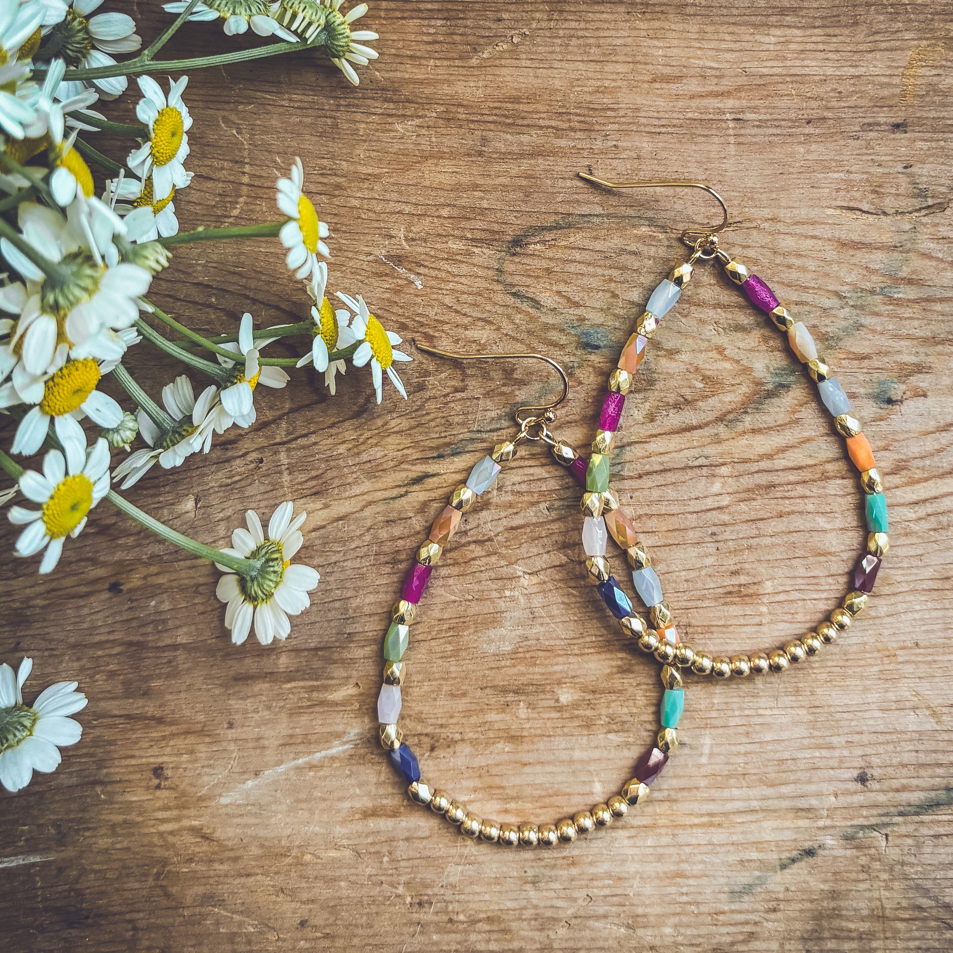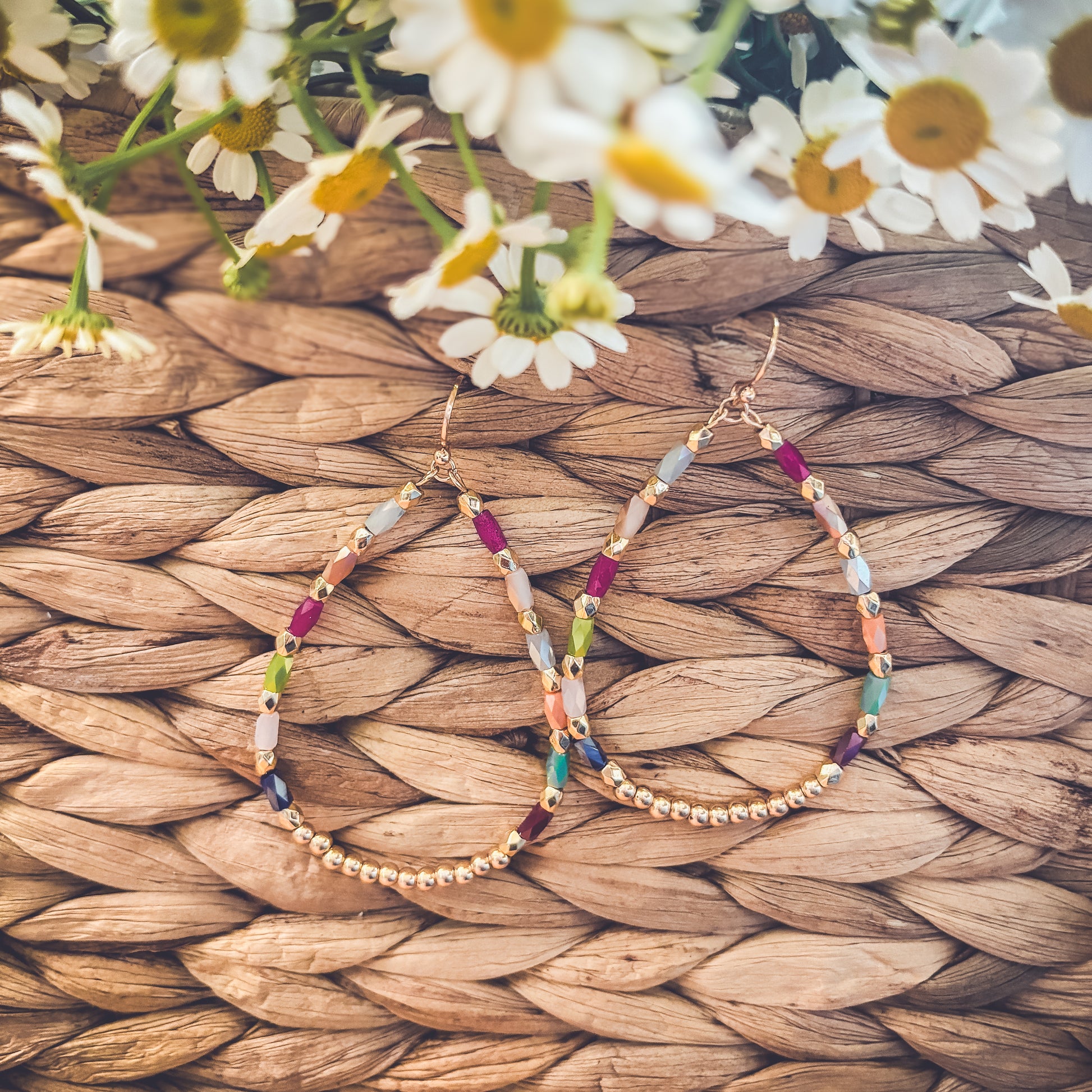 Grace your ears with our beautiful colorful drop earrings. Timelessly chic, these earrings showcase the lustrous elegance of gold, creating a sophisticated accessory that effortlessly complements any outfit with refined grace. 2.5 inches in length