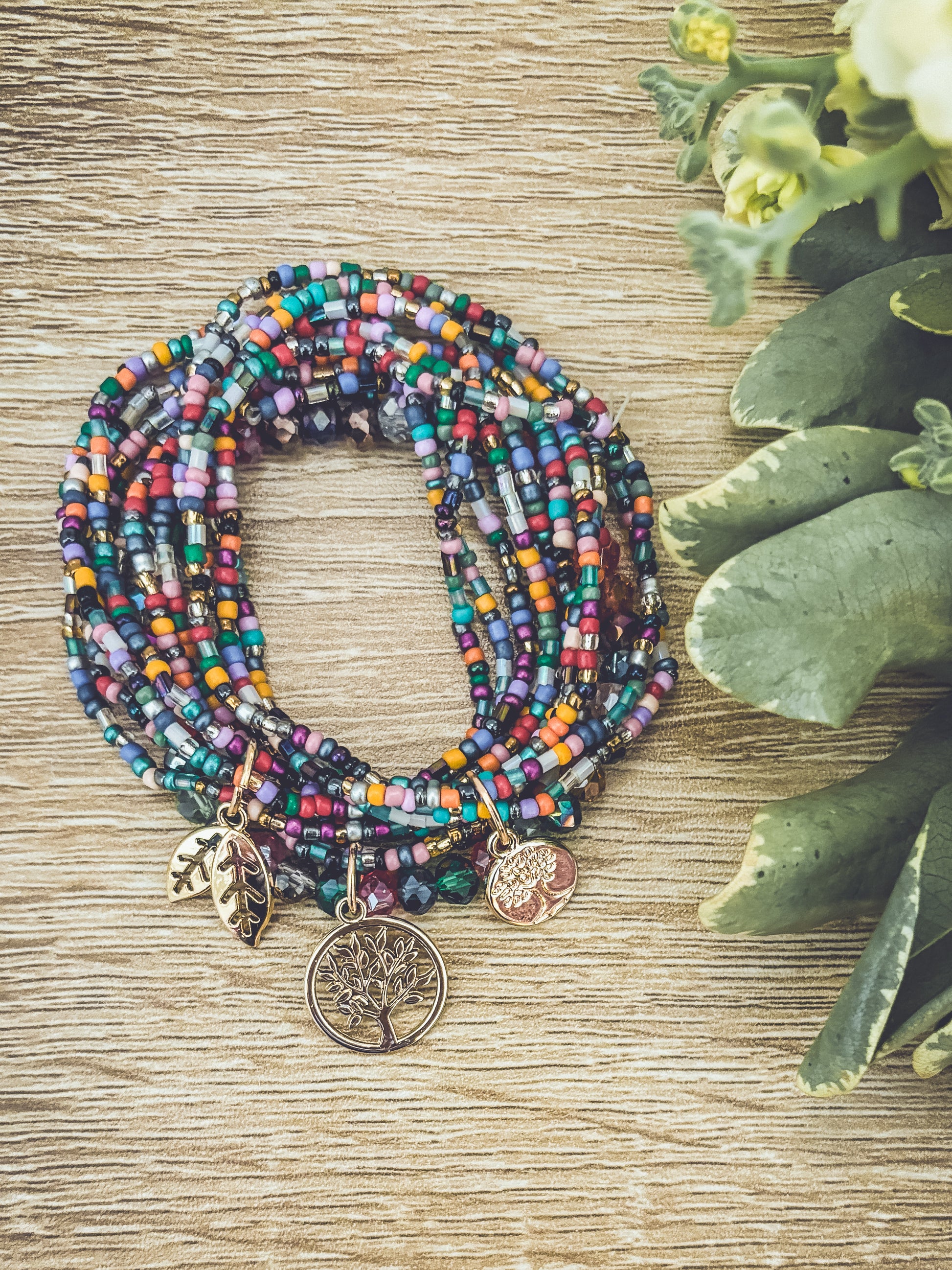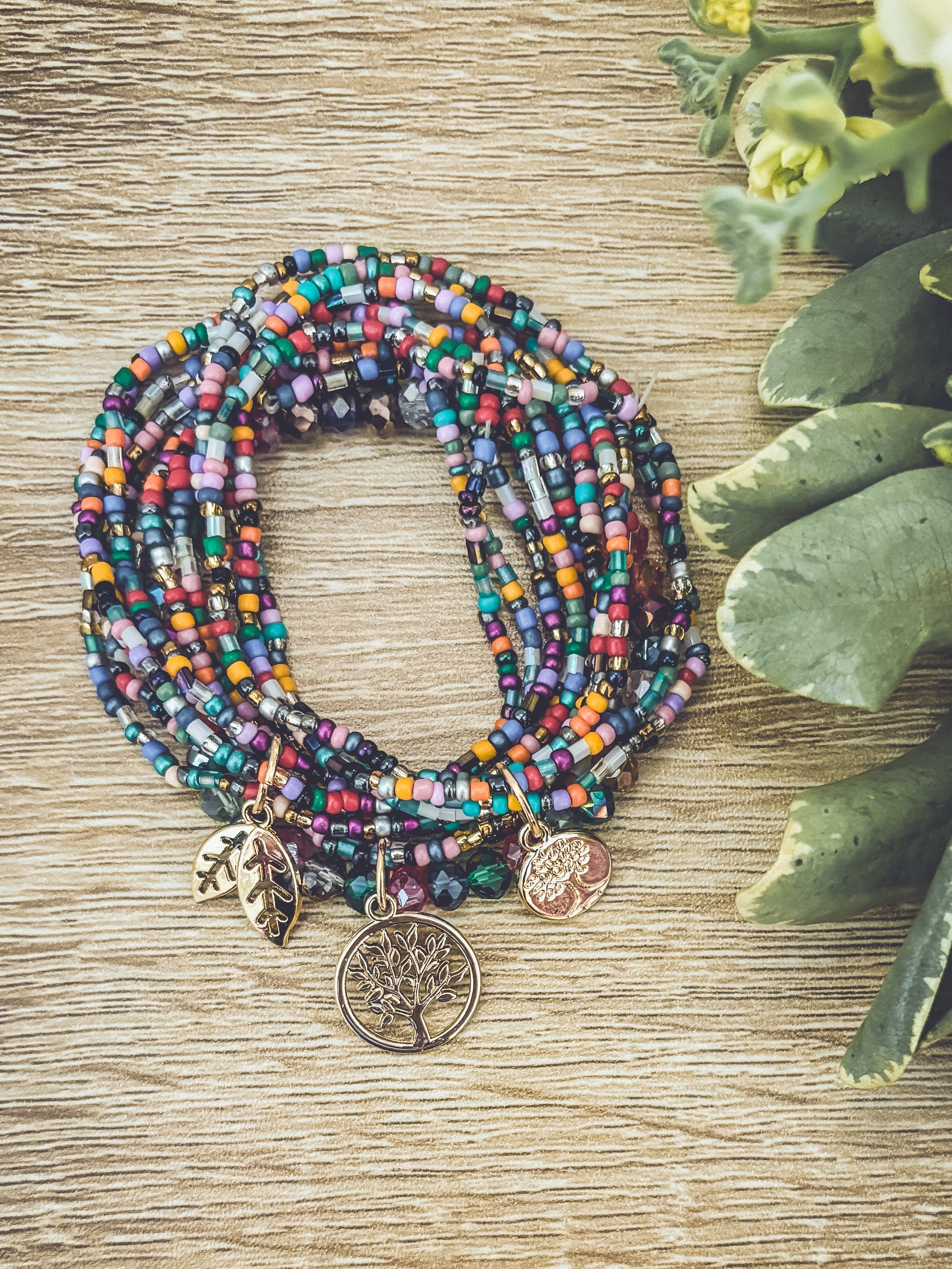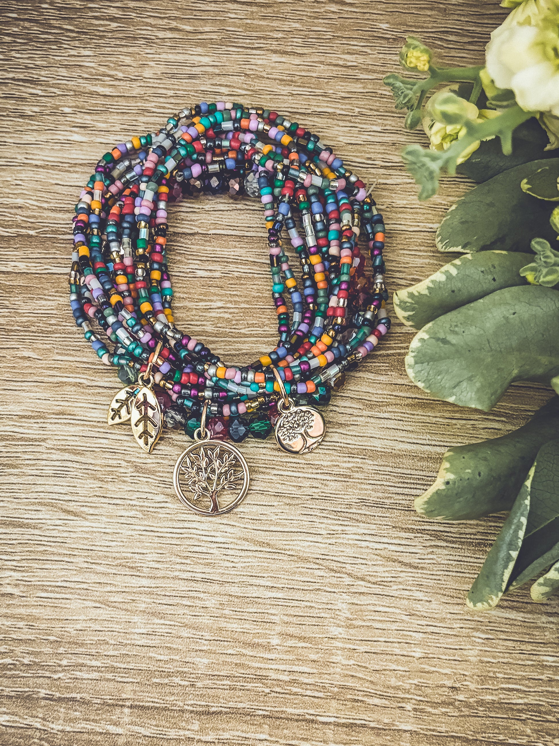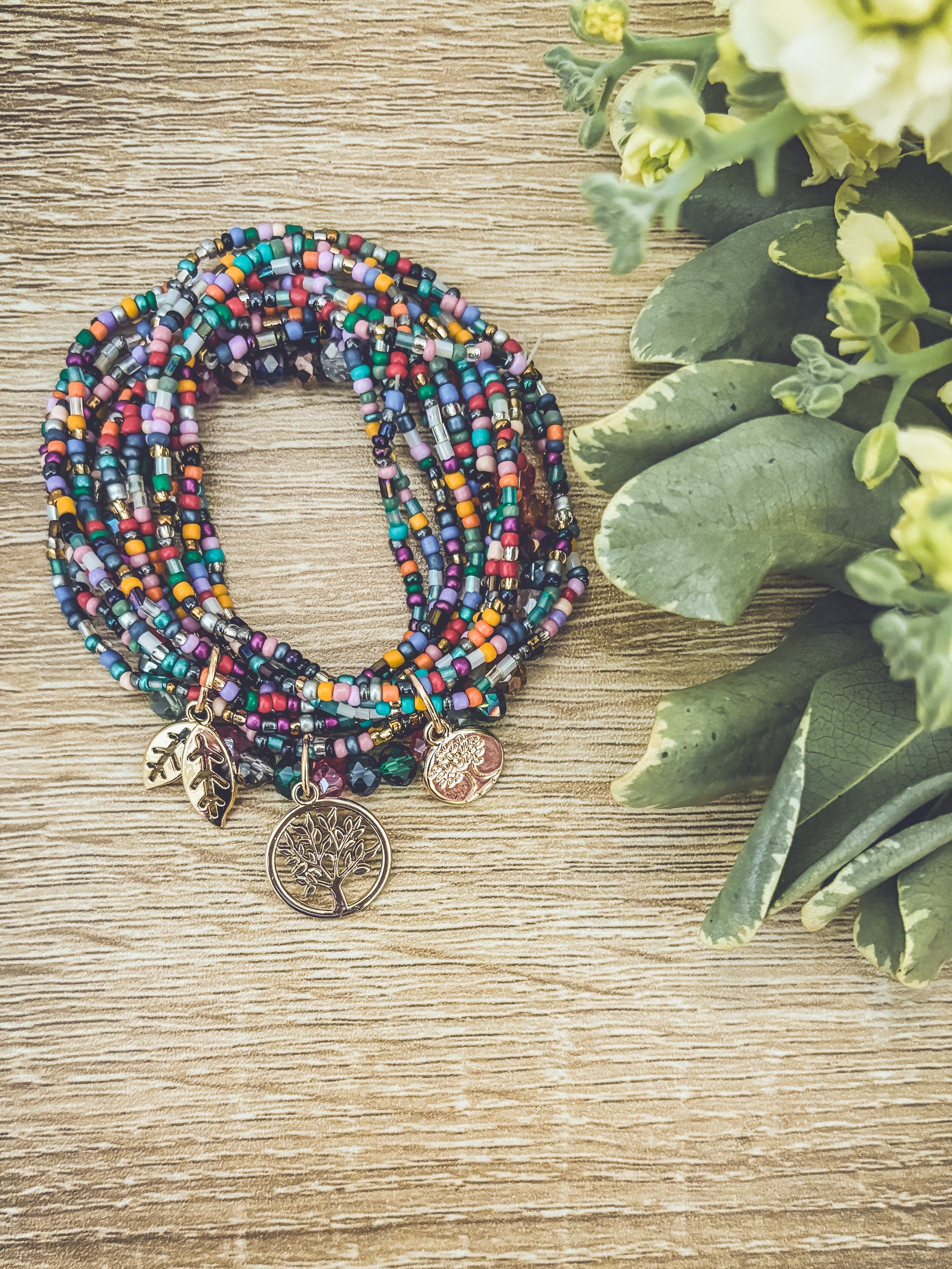 Embrace the beauty of nature with this Beautiful Colorful Tree of Life Stacking Bracelet set. 3 sets can be worn together or separately. The striking and detailed design features a tree of life charm, a symbol of growth and connection to the earth. The colorful beads accents add a touch of fun and boho freedom to the piece, making it perfect for many occasions.