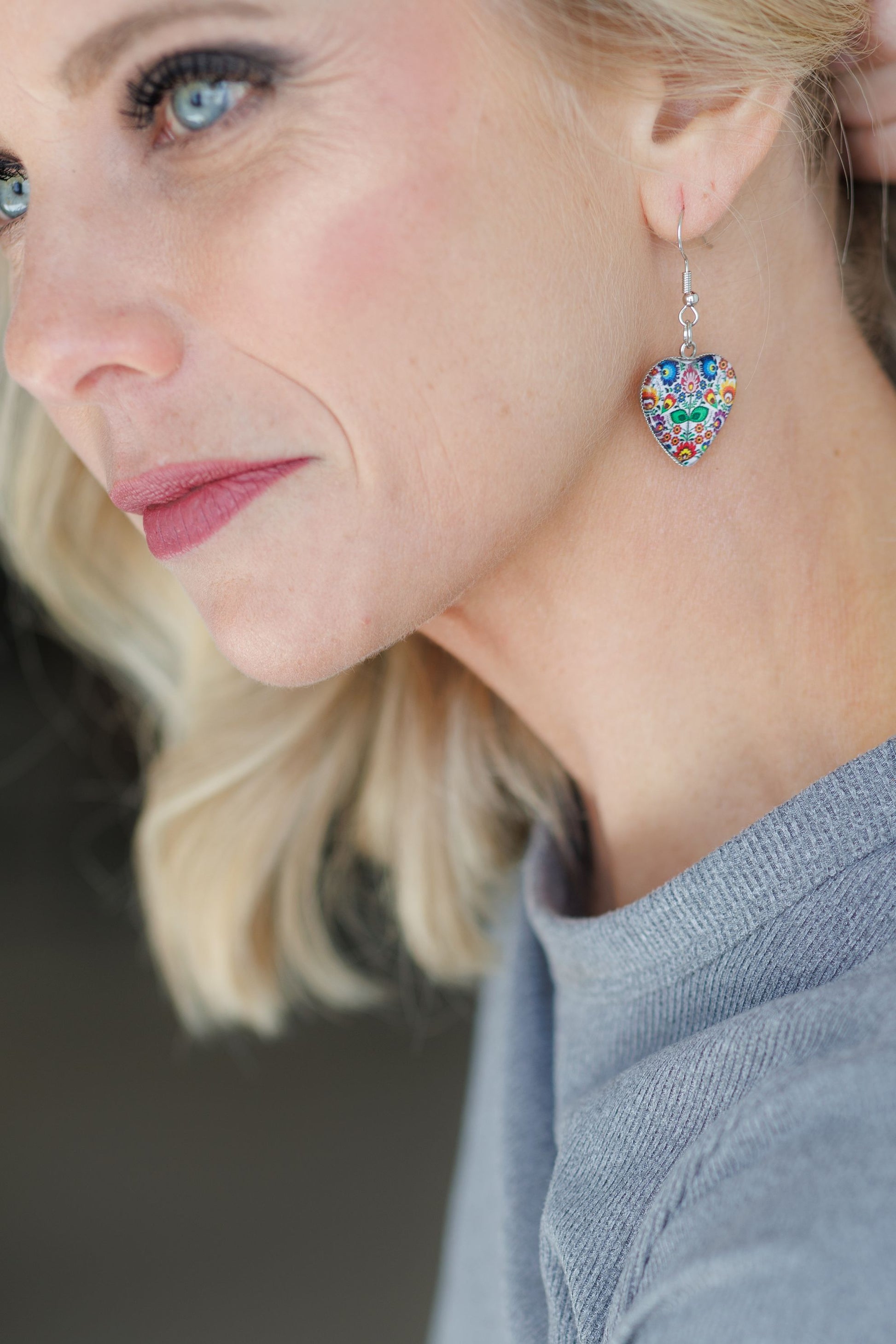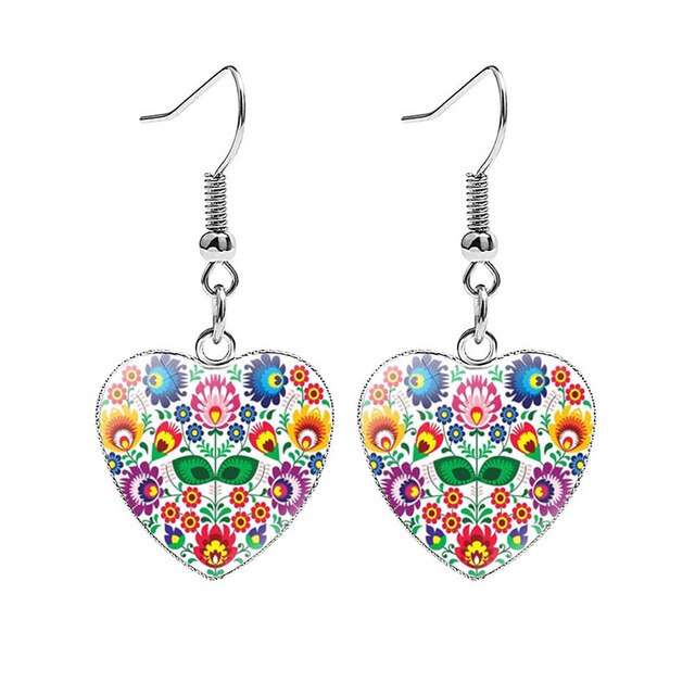 These beautiful heart-shaped earrings boast a charming folk style, with intricate details and vibrant colors that catch the eye. A perfect accessory for those who love unique, artistic jewelry. About the size of a quarter.
