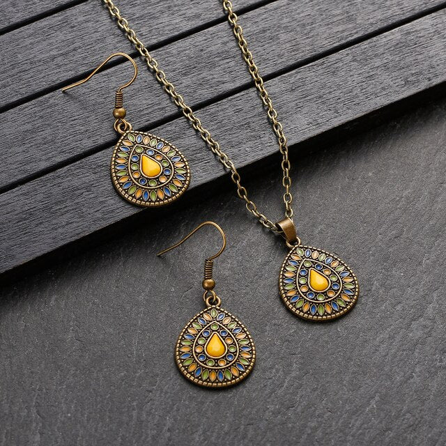Beautiful Yellow Rustic Tear Drop Earring and Necklace Set