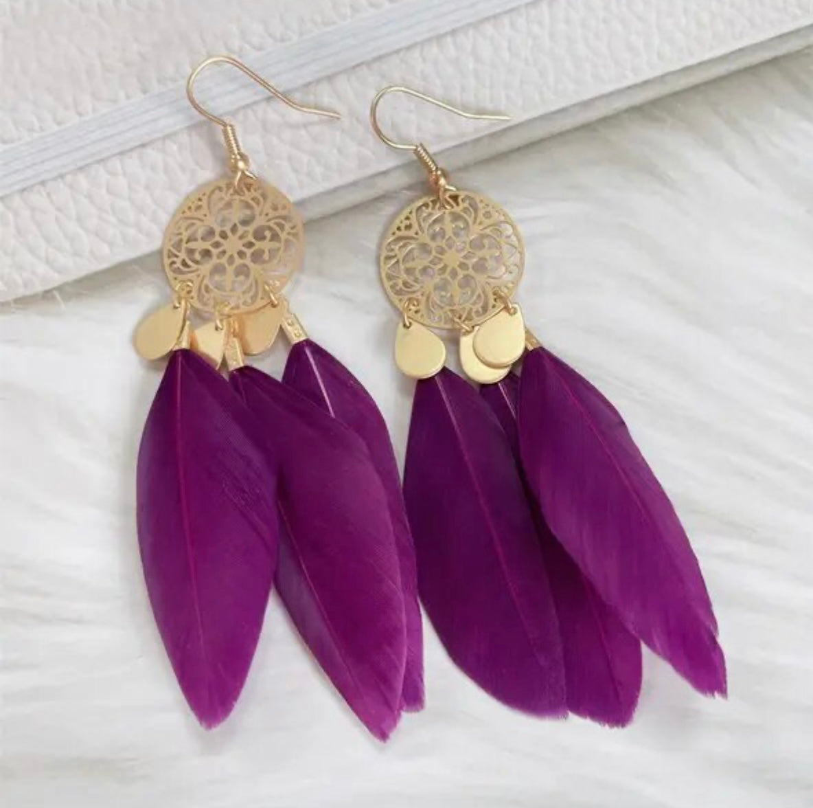 Elevate your style with our Beautiful Gold and Purple Feather Earrings. Crafted with care, these unique earrings feature a delicate feather design with a beautiful gold and green color combination that's perfect for adding a touch of nature-inspired beauty to your outfit.