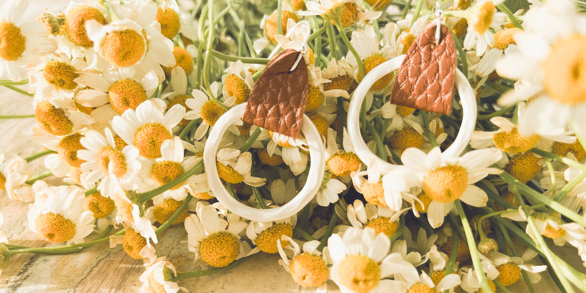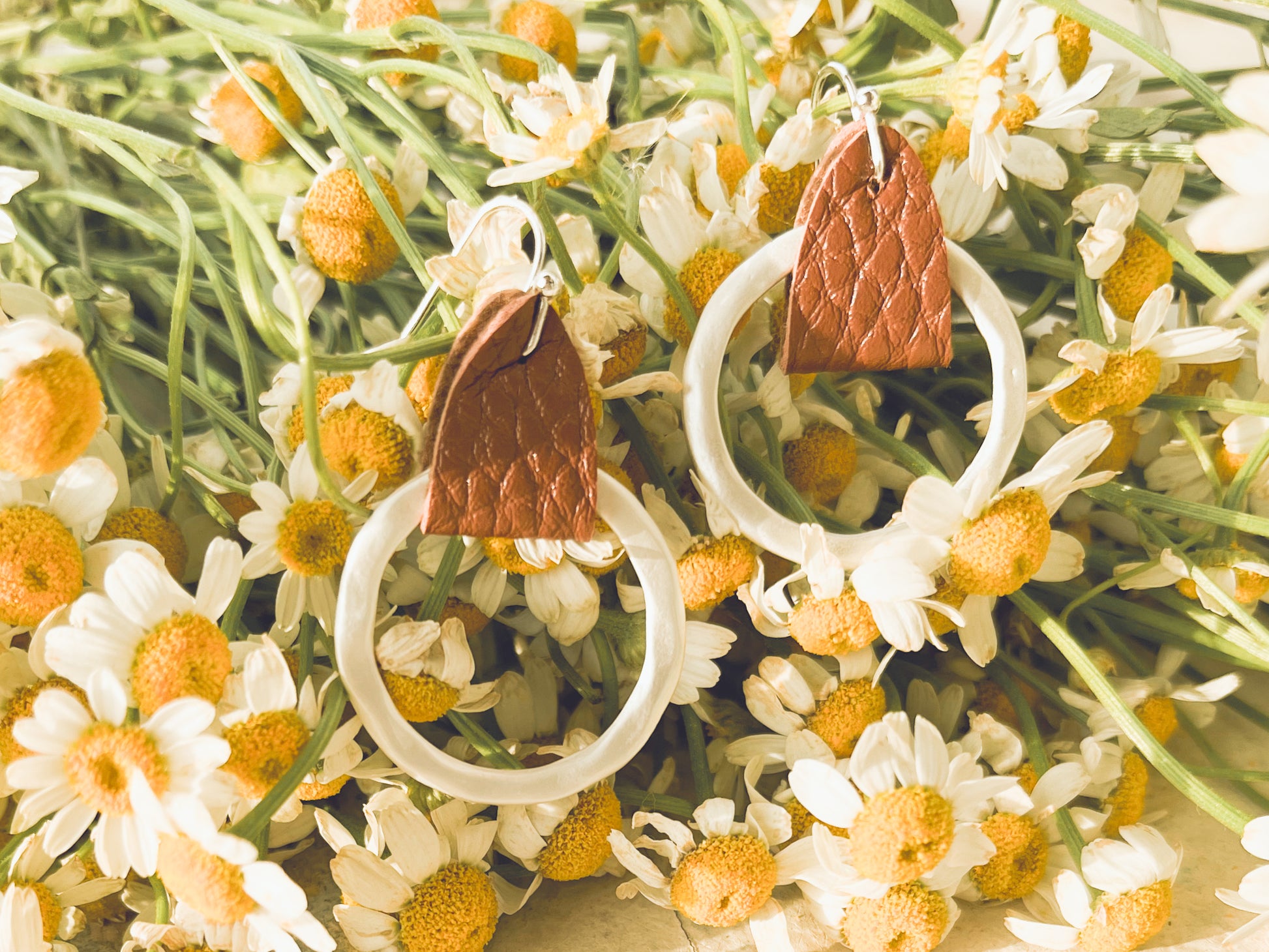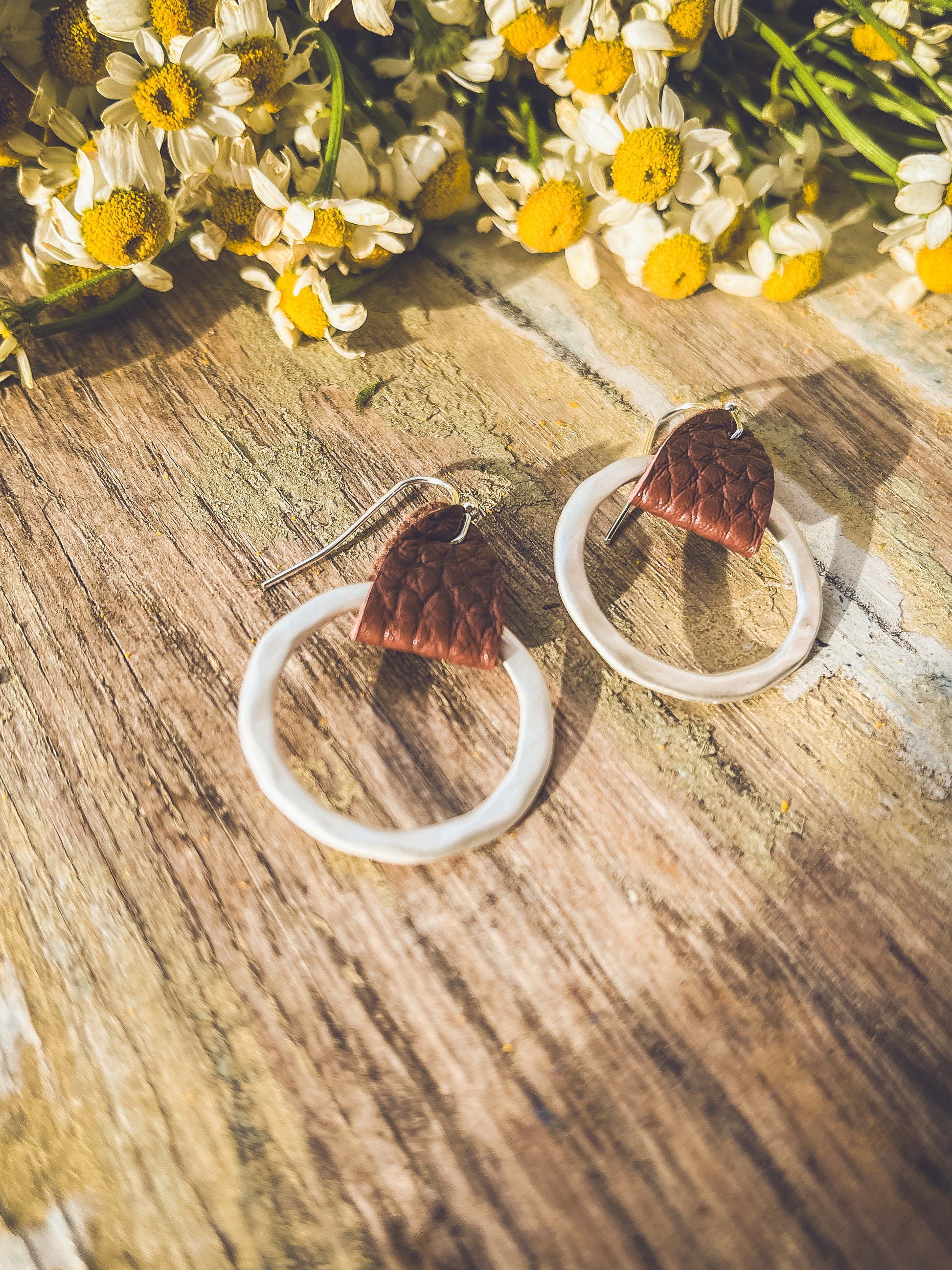 These stylish earrings feature a unique combination of leather with a classic finished hoop design. Made with high-quality materials, these earrings are durable and lightweight, making them comfortable to wear. Order now and add a touch of sophistication and edge to your look with these beautiful and fashionable earrings that are perfect for any occasion! Roughly the size of a quarter