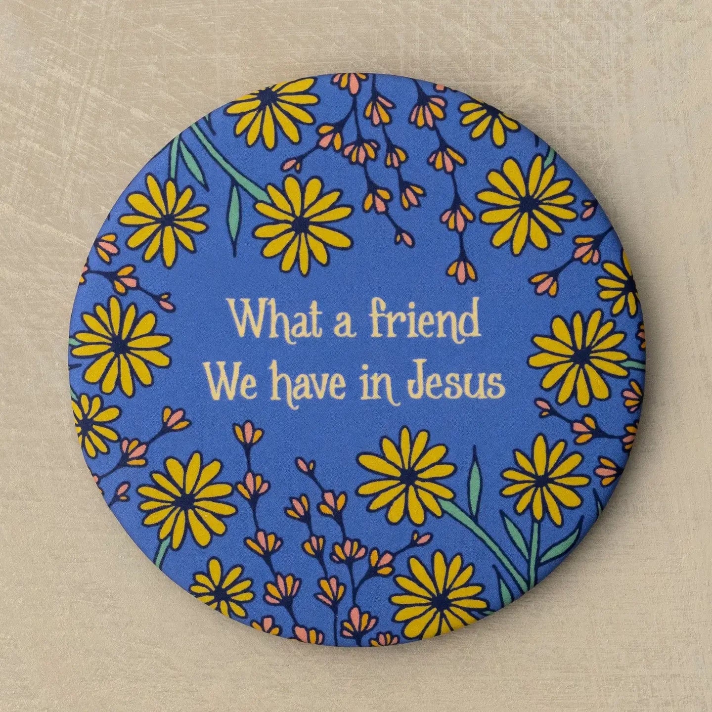 The "What A Friend" hymn magnet features lines from the beloved hymn What A Friend We Have In Jesus. The text is surrounded by a cheerful floral design with a blueberry purple background. Illustrated by Kate Whitley. • 3 inches with full magnet back • Durable matte finish • Affixed to a backing card and packaged in protective bag for gift giving • Printed in the USA at Busy Beaver Button Co. • Text: "What a friend We have in Jesus"
